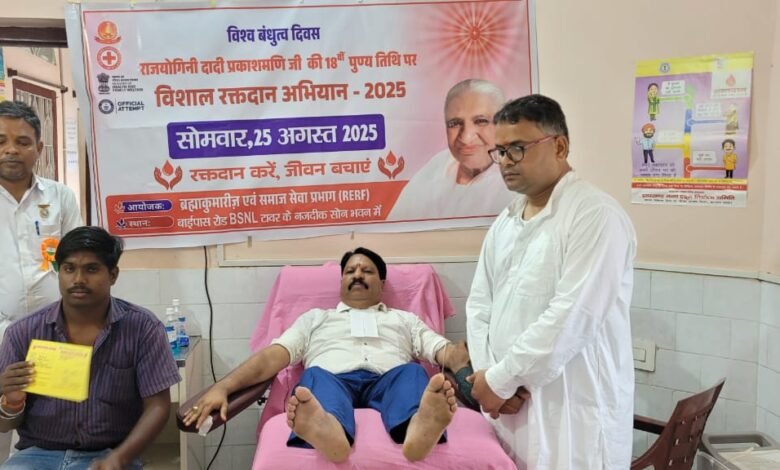विश्व बंधुत्व दिवस पर ब्रह्माकुमारी ईश्वरीय विद्यालय के भाई कार्यकर्ता लोग रक्तदान की।
